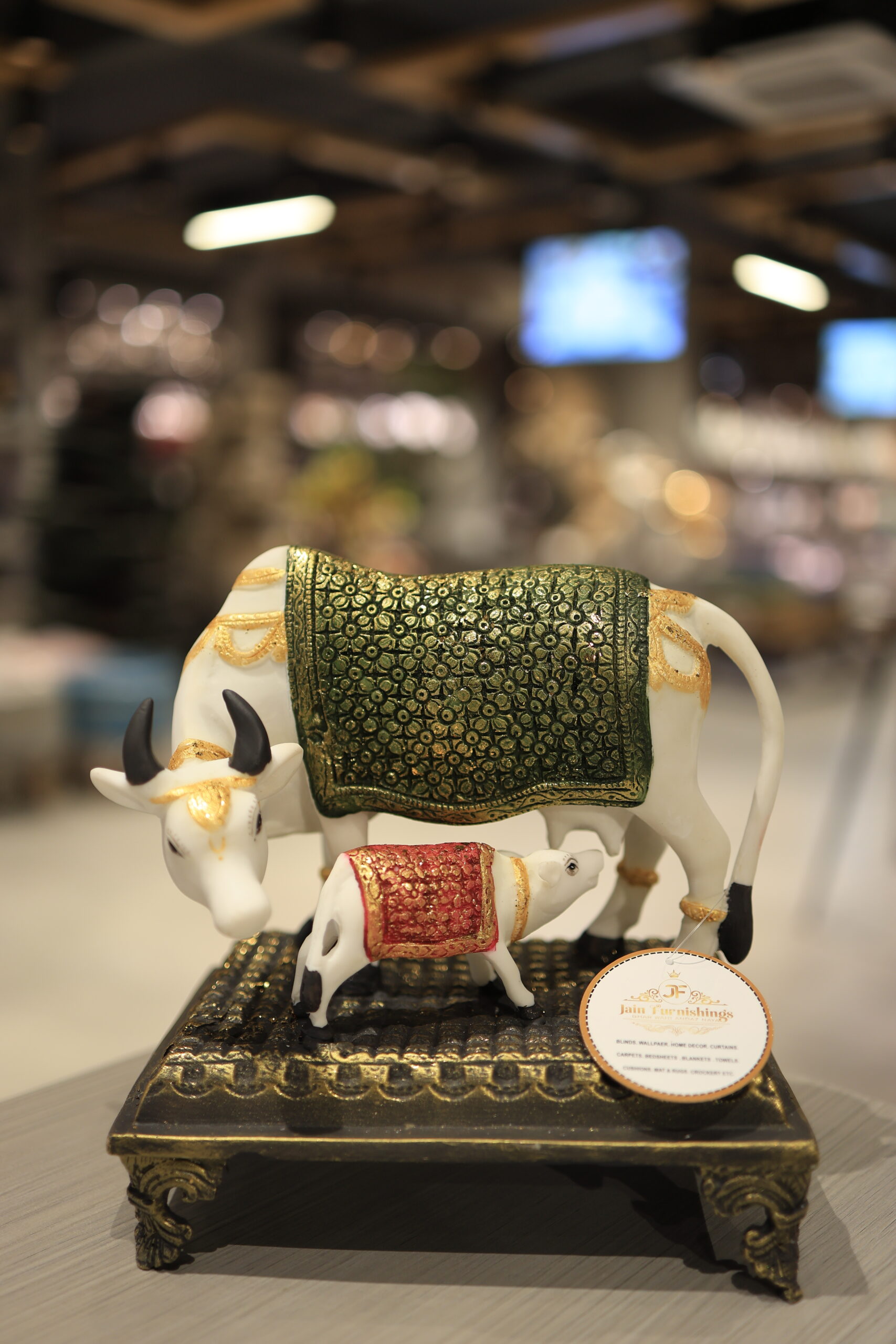This beautifully crafted statue features a serene white mother cow and her calf, both adorned with exceptionally detailed and vibrant coverings. The mother cow proudly displays a rich emerald green, intricately patterned blanket with gold accents, while the calf is equally charming with a royal red, gold-embroidered covering. Both figures also feature delicate gold detailing on their faces and horns, adding to their regal appearance.